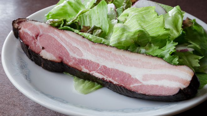 1センチ以上の厚みが迫力。燻製肉の香りと旨みを味わって。